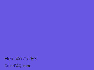 Hex #6757e3 Color is a light indigo color and the nearest color is Majorelle Blue #6050dc. Hex code #6757e3 and RGB value is rgb(103,87,227). In RGB color space, this color is composed of 40% red, 34% green, 89% blue, In CMYK color space, this color is composed of 55% cyan, 62% magenta, 0% yellow , 11% black , In HSL color space, this color has a hue angle of 247° , 71% saturation and 62% lightness.