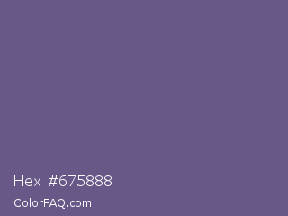 Hex #675888 Color is a normal indigo color and the nearest color is Dolphin #646077. Hex code #675888 and RGB value is rgb(103,88,136). In RGB color space, this color is composed of 40% red, 35% green, 53% blue, In CMYK color space, this color is composed of 24% cyan, 35% magenta, 0% yellow , 47% black , In HSL color space, this color has a hue angle of 259° , 21% saturation and 44% lightness.