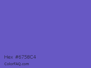Hex #6758c4 Color is a normal indigo color and the nearest color is Slate Blue #6a5acd. Hex code #6758c4 and RGB value is rgb(103,88,196). In RGB color space, this color is composed of 40% red, 35% green, 77% blue, In CMYK color space, this color is composed of 47% cyan, 55% magenta, 0% yellow , 23% black , In HSL color space, this color has a hue angle of 248° , 48% saturation and 56% lightness.