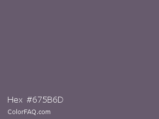 Hex #675b6d Color is a normal purple color and the nearest color is Salt Box #685e6e. Hex code #675b6d and RGB value is rgb(103,91,109). In RGB color space, this color is composed of 40% red, 36% green, 43% blue, In CMYK color space, this color is composed of 6% cyan, 17% magenta, 0% yellow , 57% black , In HSL color space, this color has a hue angle of 280° , 9% saturation and 39% lightness.