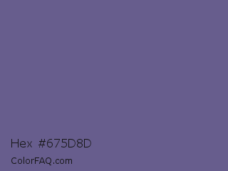 Hex #675d8d Color is a normal indigo color and the nearest color is Dark Blue Gray #666699. Hex code #675d8d and RGB value is rgb(103,93,141). In RGB color space, this color is composed of 40% red, 36% green, 55% blue, In CMYK color space, this color is composed of 27% cyan, 34% magenta, 0% yellow , 45% black , In HSL color space, this color has a hue angle of 253° , 21% saturation and 46% lightness.