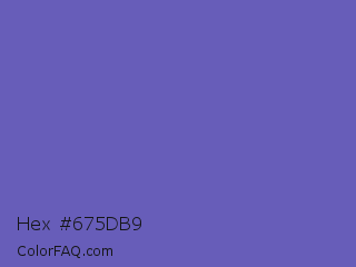 Hex #675db9 Color is a normal indigo color and the nearest color is Blue Violet #6456b7. Hex code #675db9 and RGB value is rgb(103,93,185). In RGB color space, this color is composed of 40% red, 36% green, 73% blue, In CMYK color space, this color is composed of 44% cyan, 50% magenta, 0% yellow , 27% black , In HSL color space, this color has a hue angle of 247° , 40% saturation and 55% lightness.