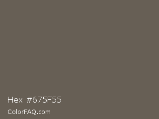 Hex #675f55 Color is a normal orange color and the nearest color is Soya Bean #6a6051. Hex code #675f55 and RGB value is rgb(103,95,85). In RGB color space, this color is composed of 40% red, 37% green, 33% blue, In CMYK color space, this color is composed of 0% cyan, 8% magenta, 17% yellow , 60% black , In HSL color space, this color has a hue angle of 33° , 10% saturation and 37% lightness.