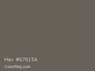 Hex #67615a Color is a normal orange color and the nearest color is Scorpion #695f62. Hex code #67615a and RGB value is rgb(103,97,90). In RGB color space, this color is composed of 40% red, 38% green, 35% blue, In CMYK color space, this color is composed of 0% cyan, 6% magenta, 13% yellow , 60% black , In HSL color space, this color has a hue angle of 32° , 7% saturation and 38% lightness.