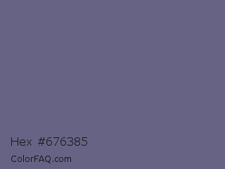 Hex #676385 Color is a normal indigo color and the nearest color is Dolphin #646077. Hex code #676385 and RGB value is rgb(103,99,133). In RGB color space, this color is composed of 40% red, 39% green, 52% blue, In CMYK color space, this color is composed of 23% cyan, 26% magenta, 0% yellow , 48% black , In HSL color space, this color has a hue angle of 247° , 15% saturation and 45% lightness.
