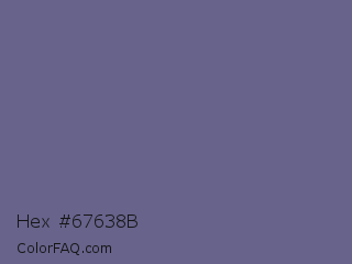 Hex #67638b Color is a normal indigo color and the nearest color is Dark Blue Gray #666699. Hex code #67638b and RGB value is rgb(103,99,139). In RGB color space, this color is composed of 40% red, 39% green, 55% blue, In CMYK color space, this color is composed of 26% cyan, 29% magenta, 0% yellow , 45% black , In HSL color space, this color has a hue angle of 246° , 17% saturation and 47% lightness.