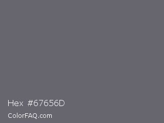Hex #67656d Color is a normal indigo color and the nearest color is Dim Gray #696969. Hex code #67656d and RGB value is rgb(103,101,109). In RGB color space, this color is composed of 40% red, 40% green, 43% blue, In CMYK color space, this color is composed of 6% cyan, 7% magenta, 0% yellow , 57% black , In HSL color space, this color has a hue angle of 255° , 4% saturation and 41% lightness.