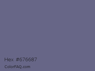 Hex #676687 Color is a normal indigo color and the nearest color is Storm Gray #717486. Hex code #676687 and RGB value is rgb(103,102,135). In RGB color space, this color is composed of 40% red, 40% green, 53% blue, In CMYK color space, this color is composed of 24% cyan, 24% magenta, 0% yellow , 47% black , In HSL color space, this color has a hue angle of 242° , 14% saturation and 46% lightness.