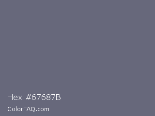 Hex #67687b Color is a normal blue color and the nearest color is Nevada #646e75. Hex code #67687b and RGB value is rgb(103,104,123). In RGB color space, this color is composed of 40% red, 41% green, 48% blue, In CMYK color space, this color is composed of 16% cyan, 15% magenta, 0% yellow , 52% black , In HSL color space, this color has a hue angle of 237° , 9% saturation and 44% lightness.
