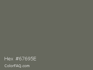 Hex #67695e Color is a normal lime color and the nearest color is Ironside Gray #676662. Hex code #67695e and RGB value is rgb(103,105,94). In RGB color space, this color is composed of 40% red, 41% green, 37% blue, In CMYK color space, this color is composed of 2% cyan, 0% magenta, 10% yellow , 59% black , In HSL color space, this color has a hue angle of 71° , 6% saturation and 39% lightness.