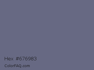 Hex #676983 Color is a normal blue color and the nearest color is Nevada #646e75. Hex code #676983 and RGB value is rgb(103,105,131). In RGB color space, this color is composed of 40% red, 41% green, 51% blue, In CMYK color space, this color is composed of 21% cyan, 20% magenta, 0% yellow , 49% black , In HSL color space, this color has a hue angle of 236° , 12% saturation and 46% lightness.