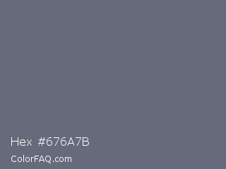 Hex #676a7b Color is a normal blue color and the nearest color is Nevada #646e75. Hex code #676a7b and RGB value is rgb(103,106,123). In RGB color space, this color is composed of 40% red, 42% green, 48% blue, In CMYK color space, this color is composed of 16% cyan, 14% magenta, 0% yellow , 52% black , In HSL color space, this color has a hue angle of 231° , 9% saturation and 44% lightness.