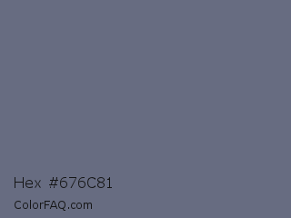 Hex #676c81 Color is a normal blue color and the nearest color is Nevada #646e75. Hex code #676c81 and RGB value is rgb(103,108,129). In RGB color space, this color is composed of 40% red, 42% green, 51% blue, In CMYK color space, this color is composed of 20% cyan, 16% magenta, 0% yellow , 49% black , In HSL color space, this color has a hue angle of 228° , 11% saturation and 45% lightness.