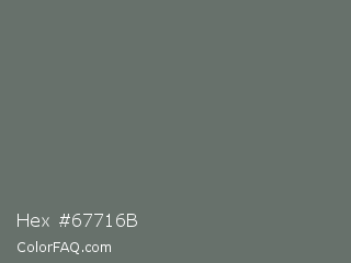 Hex #67716b Color is a normal green color and the nearest color is Dove Gray #6d6c6c. Hex code #67716b and RGB value is rgb(103,113,107). In RGB color space, this color is composed of 40% red, 44% green, 42% blue, In CMYK color space, this color is composed of 9% cyan, 0% magenta, 5% yellow , 56% black , In HSL color space, this color has a hue angle of 144° , 5% saturation and 42% lightness.