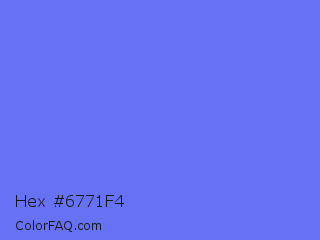Hex #6771f4 Color is a light blue color and the nearest color is Very Light Blue #6666ff. Hex code #6771f4 and RGB value is rgb(103,113,244). In RGB color space, this color is composed of 40% red, 44% green, 96% blue, In CMYK color space, this color is composed of 58% cyan, 54% magenta, 0% yellow , 4% black , In HSL color space, this color has a hue angle of 236° , 87% saturation and 68% lightness.
