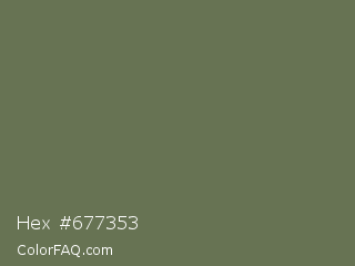 Hex #677353 Color is a normal green color and the nearest color is Siam #646a54. Hex code #677353 and RGB value is rgb(103,115,83). In RGB color space, this color is composed of 40% red, 45% green, 33% blue, In CMYK color space, this color is composed of 10% cyan, 0% magenta, 28% yellow , 55% black , In HSL color space, this color has a hue angle of 83° , 16% saturation and 39% lightness.