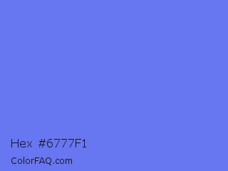 Hex #6777f1 Color is a light blue color and the nearest color is Very Light Blue #6666ff. Hex code #6777f1 and RGB value is rgb(103,119,241). In RGB color space, this color is composed of 40% red, 47% green, 95% blue, In CMYK color space, this color is composed of 57% cyan, 51% magenta, 0% yellow , 5% black , In HSL color space, this color has a hue angle of 233° , 83% saturation and 67% lightness.