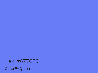 Hex #677cf6 Color is a light blue color and the nearest color is Very Light Blue #6666ff. Hex code #677cf6 and RGB value is rgb(103,124,246). In RGB color space, this color is composed of 40% red, 49% green, 96% blue, In CMYK color space, this color is composed of 58% cyan, 50% magenta, 0% yellow , 4% black , In HSL color space, this color has a hue angle of 231° , 89% saturation and 68% lightness.
