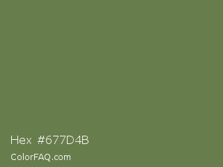 Hex #677d4b Color is a normal green color and the nearest color is Dingley #5d7747. Hex code #677d4b and RGB value is rgb(103,125,75). In RGB color space, this color is composed of 40% red, 49% green, 29% blue, In CMYK color space, this color is composed of 18% cyan, 0% magenta, 40% yellow , 51% black , In HSL color space, this color has a hue angle of 86° , 25% saturation and 39% lightness.