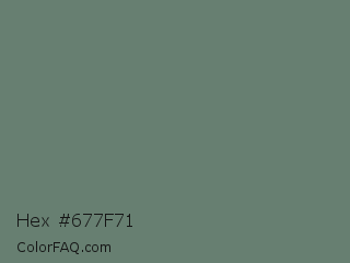 Hex #677f71 Color is a normal green color and the nearest color is Viridian Green #678975. Hex code #677f71 and RGB value is rgb(103,127,113). In RGB color space, this color is composed of 40% red, 50% green, 44% blue, In CMYK color space, this color is composed of 19% cyan, 0% magenta, 11% yellow , 50% black , In HSL color space, this color has a hue angle of 145° , 10% saturation and 45% lightness.