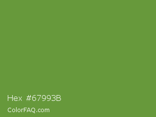 Hex #67993b Color is a normal green color and the nearest color is Palm Leaf #6f9940. Hex code #67993b and RGB value is rgb(103,153,59). In RGB color space, this color is composed of 40% red, 60% green, 23% blue, In CMYK color space, this color is composed of 33% cyan, 0% magenta, 61% yellow , 40% black , In HSL color space, this color has a hue angle of 92° , 44% saturation and 42% lightness.