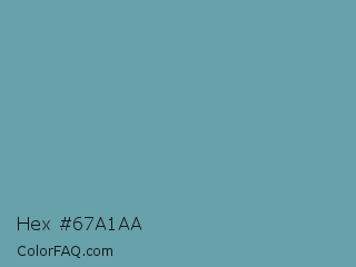 Hex #67a1aa Color is a normal cyan color and the nearest color is Cadet Blue #5f9ea0. Hex code #67a1aa and RGB value is rgb(103,161,170). In RGB color space, this color is composed of 40% red, 63% green, 67% blue, In CMYK color space, this color is composed of 39% cyan, 5% magenta, 0% yellow , 33% black , In HSL color space, this color has a hue angle of 188° , 28% saturation and 54% lightness.