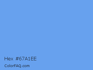 Hex #67a1ee Color is a light blue color and the nearest color is Cornflower Blue #6495ed. Hex code #67a1ee and RGB value is rgb(103,161,238). In RGB color space, this color is composed of 40% red, 63% green, 93% blue, In CMYK color space, this color is composed of 57% cyan, 32% magenta, 0% yellow , 7% black , In HSL color space, this color has a hue angle of 214° , 80% saturation and 67% lightness.