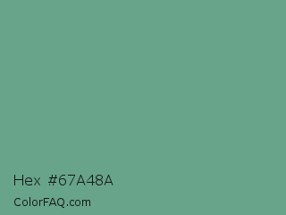 Hex #67a48a Color is a normal green color and the nearest color is Patina #639a8f. Hex code #67a48a and RGB value is rgb(103,164,138). In RGB color space, this color is composed of 40% red, 64% green, 54% blue, In CMYK color space, this color is composed of 37% cyan, 0% magenta, 16% yellow , 36% black , In HSL color space, this color has a hue angle of 154° , 25% saturation and 52% lightness.