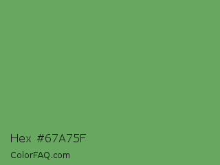 Hex #67a75f Color is a normal green color and the nearest color is Fern #63b76c. Hex code #67a75f and RGB value is rgb(103,167,95). In RGB color space, this color is composed of 40% red, 65% green, 37% blue, In CMYK color space, this color is composed of 38% cyan, 0% magenta, 43% yellow , 35% black , In HSL color space, this color has a hue angle of 113° , 29% saturation and 51% lightness.