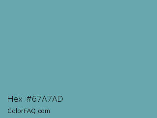 Hex #67a7ad Color is a normal cyan color and the nearest color is Tradewind #5fb3ac. Hex code #67a7ad and RGB value is rgb(103,167,173). In RGB color space, this color is composed of 40% red, 65% green, 68% blue, In CMYK color space, this color is composed of 40% cyan, 3% magenta, 0% yellow , 32% black , In HSL color space, this color has a hue angle of 185° , 30% saturation and 54% lightness.