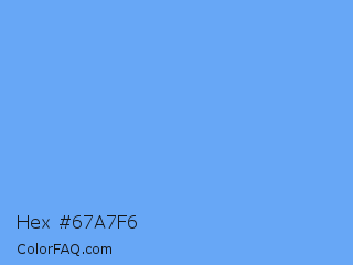 Hex #67a7f6 Color is a light blue color and the nearest color is Blue Jeans #5dadec. Hex code #67a7f6 and RGB value is rgb(103,167,246). In RGB color space, this color is composed of 40% red, 65% green, 96% blue, In CMYK color space, this color is composed of 58% cyan, 32% magenta, 0% yellow , 4% black , In HSL color space, this color has a hue angle of 213° , 89% saturation and 68% lightness.