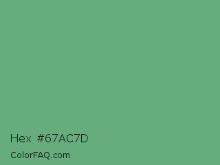 Hex #67ac7d Color is a normal green color and the nearest color is Shiny Shamrock #5fa778. Hex code #67ac7d and RGB value is rgb(103,172,125). In RGB color space, this color is composed of 40% red, 67% green, 49% blue, In CMYK color space, this color is composed of 40% cyan, 0% magenta, 27% yellow , 33% black , In HSL color space, this color has a hue angle of 139° , 29% saturation and 54% lightness.