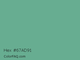 Hex #67ad91 Color is a normal green color and the nearest color is Silver Tree #66b58f. Hex code #67ad91 and RGB value is rgb(103,173,145). In RGB color space, this color is composed of 40% red, 68% green, 57% blue, In CMYK color space, this color is composed of 40% cyan, 0% magenta, 16% yellow , 32% black , In HSL color space, this color has a hue angle of 156° , 30% saturation and 54% lightness.