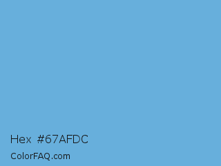 Hex #67afdc Color is a light blue color and the nearest color is Little Boy Blue #6ca0dc. Hex code #67afdc and RGB value is rgb(103,175,220). In RGB color space, this color is composed of 40% red, 69% green, 86% blue, In CMYK color space, this color is composed of 53% cyan, 20% magenta, 0% yellow , 14% black , In HSL color space, this color has a hue angle of 203° , 63% saturation and 63% lightness.