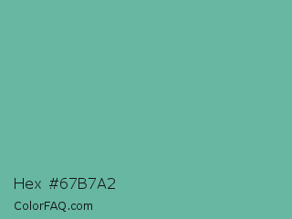 Hex #67b7a2 Color is a normal cyan color and the nearest color is Green Sheen #6eaea1. Hex code #67b7a2 and RGB value is rgb(103,183,162). In RGB color space, this color is composed of 40% red, 72% green, 64% blue, In CMYK color space, this color is composed of 44% cyan, 0% magenta, 11% yellow , 28% black , In HSL color space, this color has a hue angle of 164° , 36% saturation and 56% lightness.