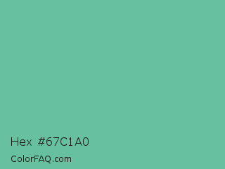 Hex #67c1a0 Color is a normal green color and the nearest color is Tradewind #5fb3ac. Hex code #67c1a0 and RGB value is rgb(103,193,160). In RGB color space, this color is composed of 40% red, 76% green, 63% blue, In CMYK color space, this color is composed of 47% cyan, 0% magenta, 17% yellow , 24% black , In HSL color space, this color has a hue angle of 158° , 42% saturation and 58% lightness.