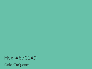 Hex #67c1a9 Color is a normal cyan color and the nearest color is Tradewind #5fb3ac. Hex code #67c1a9 and RGB value is rgb(103,193,169). In RGB color space, this color is composed of 40% red, 76% green, 66% blue, In CMYK color space, this color is composed of 47% cyan, 0% magenta, 12% yellow , 24% black , In HSL color space, this color has a hue angle of 164° , 42% saturation and 58% lightness.