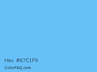 Hex #67c1f9 Color is a light blue color and the nearest color is Maya Blue #73c2fb. Hex code #67c1f9 and RGB value is rgb(103,193,249). In RGB color space, this color is composed of 40% red, 76% green, 98% blue, In CMYK color space, this color is composed of 59% cyan, 22% magenta, 0% yellow , 2% black , In HSL color space, this color has a hue angle of 203° , 92% saturation and 69% lightness.