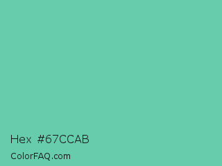 Hex #67ccab Color is a normal green color and the nearest color is Medium Aquamarine #66ddaa. Hex code #67ccab and RGB value is rgb(103,204,171). In RGB color space, this color is composed of 40% red, 80% green, 67% blue, In CMYK color space, this color is composed of 50% cyan, 0% magenta, 16% yellow , 20% black , In HSL color space, this color has a hue angle of 160° , 50% saturation and 60% lightness.