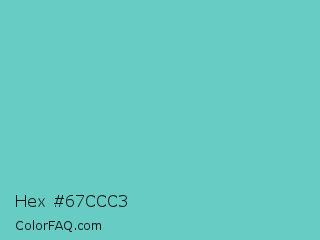 Hex #67ccc3 Color is a normal cyan color and the nearest color is Downy #6fd0c5. Hex code #67ccc3 and RGB value is rgb(103,204,195). In RGB color space, this color is composed of 40% red, 80% green, 76% blue, In CMYK color space, this color is composed of 50% cyan, 0% magenta, 4% yellow , 20% black , In HSL color space, this color has a hue angle of 175° , 50% saturation and 60% lightness.