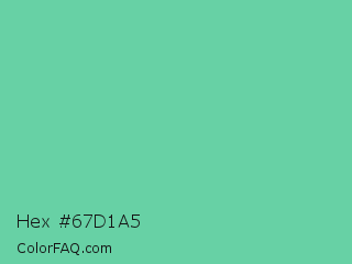 Hex #67d1a5 Color is a light green color and the nearest color is Medium Aquamarine #66ddaa. Hex code #67d1a5 and RGB value is rgb(103,209,165). In RGB color space, this color is composed of 40% red, 82% green, 65% blue, In CMYK color space, this color is composed of 51% cyan, 0% magenta, 21% yellow , 18% black , In HSL color space, this color has a hue angle of 155° , 54% saturation and 61% lightness.