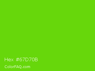 Hex #67d70b Color is a normal green color and the nearest color is Alien Armpit #84de02. Hex code #67d70b and RGB value is rgb(103,215,11). In RGB color space, this color is composed of 40% red, 84% green, 4% blue, In CMYK color space, this color is composed of 52% cyan, 0% magenta, 95% yellow , 16% black , In HSL color space, this color has a hue angle of 93° , 90% saturation and 44% lightness.