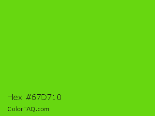 Hex #67d710 Color is a normal green color and the nearest color is Lima #76bd17. Hex code #67d710 and RGB value is rgb(103,215,16). In RGB color space, this color is composed of 40% red, 84% green, 6% blue, In CMYK color space, this color is composed of 52% cyan, 0% magenta, 93% yellow , 16% black , In HSL color space, this color has a hue angle of 94° , 86% saturation and 45% lightness.