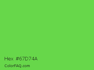 Hex #67d74a Color is a normal green color and the nearest color is Mantis #74c365. Hex code #67d74a and RGB value is rgb(103,215,74). In RGB color space, this color is composed of 40% red, 84% green, 29% blue, In CMYK color space, this color is composed of 52% cyan, 0% magenta, 66% yellow , 16% black , In HSL color space, this color has a hue angle of 108° , 64% saturation and 57% lightness.