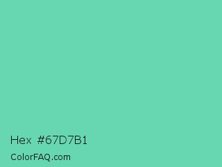 Hex #67d7b1 Color is a light green color and the nearest color is Medium Aquamarine #66ddaa. Hex code #67d7b1 and RGB value is rgb(103,215,177). In RGB color space, this color is composed of 40% red, 84% green, 69% blue, In CMYK color space, this color is composed of 52% cyan, 0% magenta, 18% yellow , 16% black , In HSL color space, this color has a hue angle of 160° , 58% saturation and 62% lightness.