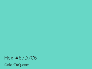 Hex #67d7c6 Color is a light cyan color and the nearest color is Downy #6fd0c5. Hex code #67d7c6 and RGB value is rgb(103,215,198). In RGB color space, this color is composed of 40% red, 84% green, 78% blue, In CMYK color space, this color is composed of 52% cyan, 0% magenta, 8% yellow , 16% black , In HSL color space, this color has a hue angle of 171° , 58% saturation and 62% lightness.