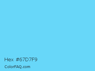 Hex #67d7f9 Color is a light blue color and the nearest color is Turquoise Blue #6cdae7. Hex code #67d7f9 and RGB value is rgb(103,215,249). In RGB color space, this color is composed of 40% red, 84% green, 98% blue, In CMYK color space, this color is composed of 59% cyan, 14% magenta, 0% yellow , 2% black , In HSL color space, this color has a hue angle of 194° , 92% saturation and 69% lightness.