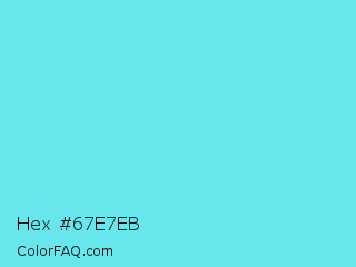Hex #67e7eb Color is a light cyan color and the nearest color is Turquoise Blue #6cdae7. Hex code #67e7eb and RGB value is rgb(103,231,235). In RGB color space, this color is composed of 40% red, 91% green, 92% blue, In CMYK color space, this color is composed of 56% cyan, 2% magenta, 0% yellow , 8% black , In HSL color space, this color has a hue angle of 182° , 77% saturation and 66% lightness.