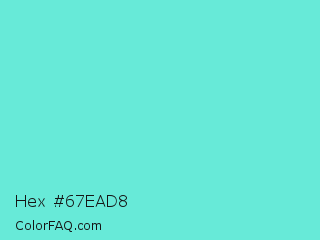Hex #67ead8 Color is a light cyan color and the nearest color is Aquamarine Blue #71d9e2. Hex code #67ead8 and RGB value is rgb(103,234,216). In RGB color space, this color is composed of 40% red, 92% green, 85% blue, In CMYK color space, this color is composed of 56% cyan, 0% magenta, 8% yellow , 8% black , In HSL color space, this color has a hue angle of 172° , 76% saturation and 66% lightness.