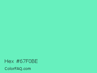 Hex #67f0be Color is a light green color and the nearest color is Medium Aquamarine #66ddaa. Hex code #67f0be and RGB value is rgb(103,240,190). In RGB color space, this color is composed of 40% red, 94% green, 75% blue, In CMYK color space, this color is composed of 57% cyan, 0% magenta, 21% yellow , 6% black , In HSL color space, this color has a hue angle of 158° , 82% saturation and 67% lightness.